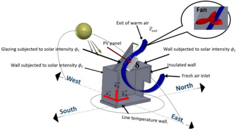 We consider a cavity with a rectangular cross-section equipped with a photovoltaic (PV) chimney, as illustrated in Figure 1. The photovoltaic panel (PV) of the chimney is exposed to solar radiation $\Phi_i$ through glazing. The chimney thus forms an airflow channel inclined at an angle $\delta=9^{\circ}$, with a thickness e. The inclination angle δ is selected to optimize the solar irradiation received by the photovoltaic (PV) panel, thereby ensuring sufficient electricity production to power the fan. This inclination falls within the recommended range for solar installations in the Sahel region, which benefits from high solar irradiance throughout the year [38].