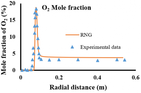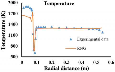Therefore, it can be concluded that the most accurate predictions of important parameters like temperature, axial velocity, tangential velocity, and oxygen mole fraction in the natural gas combustor are obtained from simulations that use the RNG k-ε turbulence model in conjunction with the Discrete Ordinates (DO) radiation model and the non-premixed PDF combustion model. Because each model has complementary strengths in capturing the underlying physics, this combination performs best. By adding strain-rate corrections and swirl modifications, the RNG k-ε model enhances the standard k-ε model and is especially useful for simulating the highly swirling, recirculating flows found in combustors. Accurately predicting these recirculation zones guarantees a realistic flow field, which is essential for flame stabilization and improved fuel and oxidizer mixing.