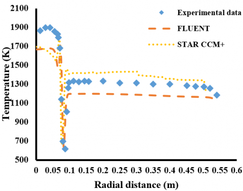 Figure 13. Comparison of temperature predictions at 27 mm from the burner throat between Fluent, STAR-CCM+ and experimental data