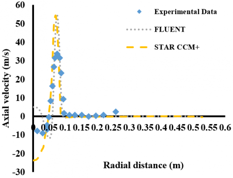 Figures 11 and 12 depict the temperature and velocity variation between ANSYS Fluent and STAR CCM+, respectively. They are shown on the same scale. The changes in colour intensity can be ignored as both the software have different colour schemes. The detailed comparative analysis of the output parameters (temperature, velocities, mole fractions of various species) using ANSYS Fluent and STAR-CCM+ is performed using the XY-Plot (Figures 13-18) at the distance of 27 mm from the burner throat, because the highly reacting zone is near the throat.