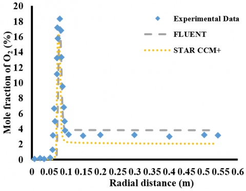 Figure 16. Comparison of O2 mole fraction predictions at 27 mm from the burner throat between Fluent, STAR-CCM+ and experimental data