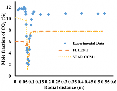 The CO₂ mole fraction plots provide additional insight into these discrepancies. Near the burner region, STAR-CCM+ predictions are in very close agreement with experimental data, indicating that the solver is effectively capturing the primary combustion zone, where rapid oxidation of hydrocarbons takes place. This accuracy highlights STAR CCM+’s ability to represent the near-burner mixing and flame stabilization process, where small errors in turbulence chemistry coupling can have a large impact on product species formation. On the other hand, both solvers underpredict CO₂ mole fraction in regions away from the burner. This underprediction suggests incomplete conversion of intermediate species or insufficient residence time in the post-flame zone within the models. Physically, this can be linked to limitations of the RANS-based non-premixed PDF combustion approach, which may not fully resolve slow-chemistry processes, minor species oxidation, or spatial intermittency in turbulent mixing. Furthermore, radiative heat losses in the post-flame region reduce local temperatures, slowing reaction rates. If radiation is not perfectly captured, this can also contribute to lower predicted CO₂ concentrations compared to experiments.