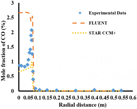 Figure 18. Comparison of CO mole fraction predictions at 27 mm from the burner throat between Fluent, STAR-CCM+ and experimental data