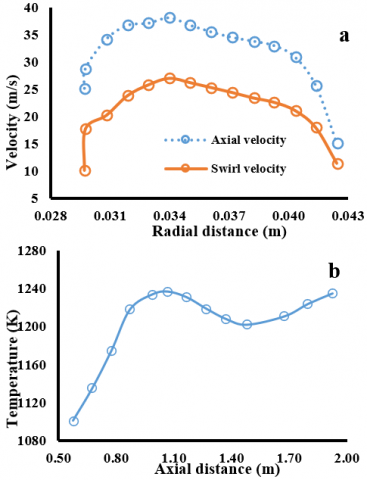 Figure 2. (a) Axial and swirl velocity profiles, (b) Temperature profile