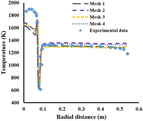 While engineering simulations offer tremendous advantages, caution must be taken before implementing the results. CFD modelling involves solving the Navier Stokes equation, which is based on the law of conservation of mass and momentum [6-9]. However, many closures are required to account for turbulence, chemical reactions, combustion effects while using RANS approach for modelling random processes. Turbulence can be modelled using simpler and economical two-equation models (k-ɛ, k-ω etc.), full Reynold’s stress models, LES and most accurate but computationally expensive. To model the effect of radiation, several approaches like Discrete Ordinate, Grey and Surface to Surface radiation models are widely used. There are variations in combustion modelling approaches too. The simpler species transport modelling approach is commonly used but is computationally expensive to solve more species. As the combustion reactions are kinetically mixing controlled, the accuracy in modelling kinetic and mixing rates is very important. There are flamelet approaches to model the complex combustion process. On top of everything, the mesh has a significant effect on the solution. The point we would like to make is that the robustness of the model needs to be tested thoroughly before being used. Care should be taken to ensure that the CFD model of the combustor is validated, robust and is valid over different scales and operating conditions. The mesh type, size, shape and layout have a significant impact on the solution. All these model combinations should be analysed over different mesh sizes before applying it for innovation, design and debottlenecking.