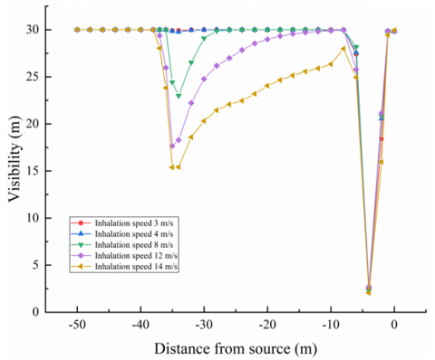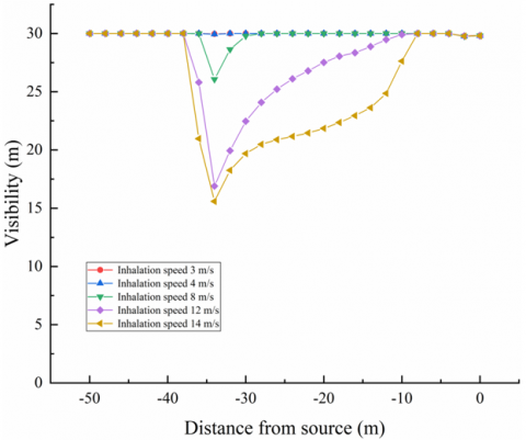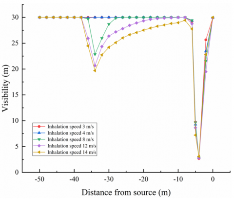 Figure 12. Variation in visibility under different exhaust velocities for a dual fire source of 5 MW