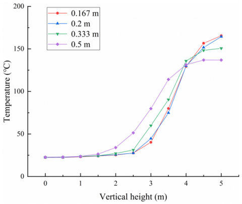 Using the 5 MW dual fire source scenario as an example, the range of permissible grid sizes was determined to be between 0.15 m and 0.599 m based on the characteristic fire diameter equation and the recommended ratio range. To select an optimal grid resolution, four candidate grid sizes—0.167 m, 0.2 m, 0.333 m, and 0.5 m—were evaluated. Simulations were conducted to examine the vertical temperature distribution at a location 8 m to the left of Fire Source A (Figure 2). The results indicated that a grid size of 0.5 m produced larger temperature fluctuations, leading to greater numerical error. In contrast, a grid size of 0.333 m yielded stable temperature profiles with acceptable accuracy. Consequently, a grid size of 0.333 m was selected for the final simulations, resulting in approximately 160,000 computational cells for the entire tunnel model.