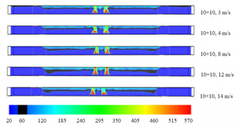 As shown in Figure 4, the temperature contour maps illustrate the distribution of temperatures in a 10 MW dual fire source tunnel fire under different exhaust velocities. The temperature fields were analyzed at 200 s after ignition.