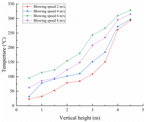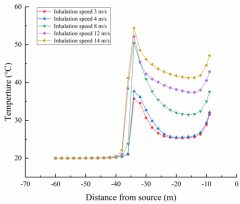 On the unprotected side, smoke stratification was observed, with vertical temperature decreasing toward the tunnel floor. At a supply velocity of 2 m/s, the temperature at the human eye level (1.8 m) was approximately 60℃, which meets the short-term safety threshold for evacuation. However, at a supply velocity of 6 m/s, the vertical temperature reached 95℃ at a height of 0.5 m, exceeding the human tolerance limit, and peaked at 328℃ at 4.5 m. These results demonstrate that an excessively high supply velocity does not necessarily improve smoke exhaust efficiency; rather, it can hinder smoke removal, causing accumulation within the tunnel. Based on the present findings, a supply velocity of 2 m/s is considered an appropriate operational parameter for the supply-exhaust air curtain system under the tested conditions.