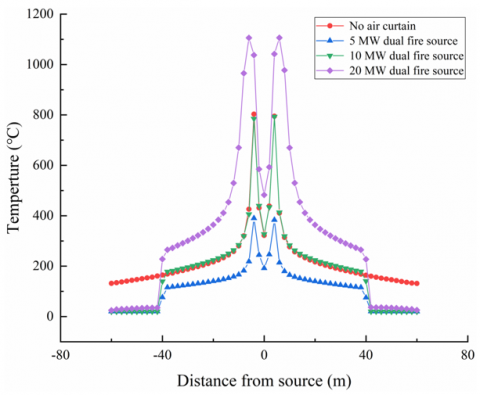 (c) Under various fire scenarios, larger dual fire source heat release rates led to higher ceiling temperatures, peaking consistently at the midpoint between the sources. Smoke temperature decreased as it spread, while significant ceiling temperature differences persisted between the air curtain zone and fire source areas. In unprotected zones, occupant-height temperatures stayed below the 60℃ tolerance threshold. Visibility dropped below 10 m only near 5 MW and 10 MW fire sources, remaining above 10 m elsewhere, with the air curtain zone maintaining around 30 m. CO levels stayed below 10 ppm, except near fire sources, ensuring safe evacuation in most areas.