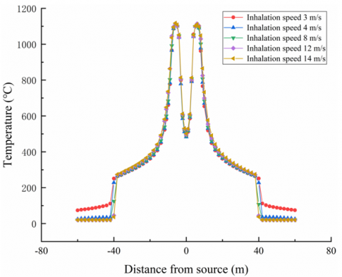 Owing to the perfectly symmetrical tunnel model adopted in the simulation, with dual fire sources positioned at the center, only measurement points on the left side of the tunnel were selected for data analysis. The temperature values were derived from the average readings at measurement points spaced at 2 m intervals over the 360 s duration of the tunnel fire scenario.