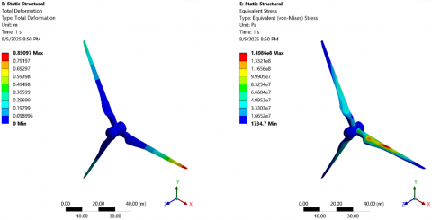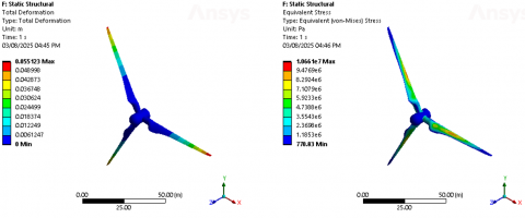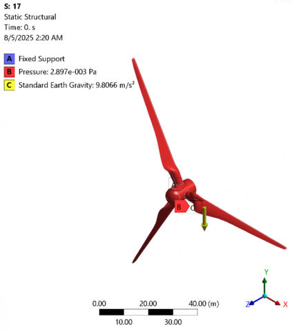 In this static structural analysis, the model of a wind turbine blade assembly as presented in Figure 9 subjected to specific boundary conditions and loading. A fixed support was applied at the hub of the blade, fully constraining all degrees of freedom to simulate the connection to the main shaft. The blades were exposed to a pressure load of 2.897 × 10⁻³ Pa acting on their surface, representing aerodynamic effects. Additionally, standard Earth gravity with an acceleration of 9.8066 m/s² was applied in the negative Y-direction to account for the self-weight of the structure. These conditions aim to evaluate the structural response of the blades under combined aerodynamic and gravitational forces.