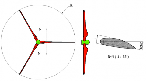 Figure 2. Drawigng 2D of the offshore three-bladed wind turbine power model
