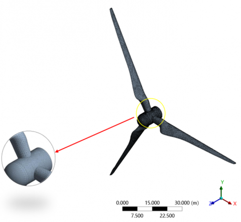 The mesh parameters used in the simulation environment were compiled and presented in Table 2. During the meshing process, mechanical physics preferences were followed to ensure appropriate resolution and accuracy for the offshore wind turbine blade analysis. An overall element size of 700 mm was applied, and the arrangement of elements was controlled automatically by the simulation program. To improve mesh quality in regions with complex geometry, adaptive scaling was employed, allowing for automatic refinement of the mesh where necessary. Additionally, defeaturing techniques were implemented to remove small, non-essential geometric details that could otherwise increased computational cost without contributing significantly to the simulation results. To improve the accuracy and reliability of the simulation, the minimum mesh size at small locations near complex surfaces and important transition zones was 0.03 meters. This meshing method was used to improve computational efficiency. This is necessary when performing aerodynamic analysis of offshore wind turbine blades.The meshing result for the computational domain was 1890732 triangular elements and 2612046 nodes. The turbine blade was meshed automatically with the mesh size 0.03 meters. The meshing result for the turbine blade was 50234 triangular elements 89737 nodes.