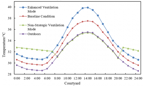 In-depth analysis of the data differences indicates that the passive cooling mechanism of Huizhou dwellings is essentially a dynamic process of precise temporal coordination between “nighttime ventilation-driven cooling” and “building thermal inertia heat retention”. The success of the “enhanced ventilation mode” lies in its maximal utilization of this synergy: sufficient nighttime ventilation acts as a thorough “cold recharge” for the building, efficiently expelling heat accumulated in walls, floors, and other envelope structures during the day, lowering their temperatures to a minimum; when doors and windows are closed during the day, these pre-cooled, high thermal capacity components act as a “natural cold source”, continuously absorbing heat from indoor air and effectively blocking the intrusion of outdoor high temperatures, maintaining indoor coolness. Conversely, the “non-strategic ventilation mode” completely disrupts this synergy: daytime ventilation continuously “injects” hot air indoors, while nighttime closure blocks the only heat dissipation path, causing heat to accumulate inside and within the building structure, ultimately resulting in system failure. The main hall, being directly connected to the courtyard, responds more sensitively to ventilation strategies and exhibits greater fluctuations than relatively enclosed side rooms, further confirming the courtyard’s critical role as the core driving component of thermally driven ventilation.