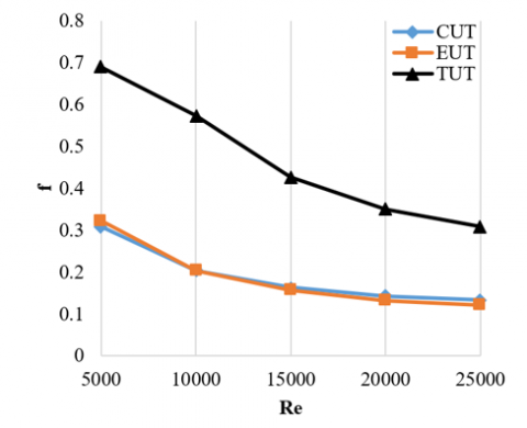 Figure 4 displays the effect of the cross-section shapes on the average difference in the friction factor for various values of the Reynolds numbers. With rising Reynolds numbers, the friction factors obtained from elliptical and circular cross-sections decrease. Based on the figure, it is clear that using U-tubes with circular or elliptic cross-sections reduce the friction factor, whereas using U-tubes with triangular cross-sections causes the friction factor to significantly increase for the same cross-section area. According to the data, the friction factor is determined to be higher for the U-tube with a triangular cross section compared to the circular and elliptical cross-sections. Using the U-bend arrangement with twist tape increases the friction factor for all the cross-section configurations that were studied. The reason behind this is the significant wall shear stress at the bend section and twisting tape.