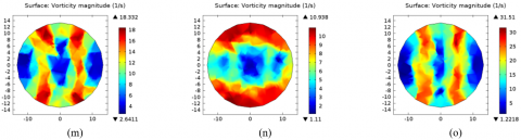 8. At 200, 400, 600, and 800 mm, the maximum vorticity without inserts is 12.358, 13.536, 13.046, and 13.046 (1/s), respectively. The vorticity increases steadily from the Centre to the wall and varies minimally. With the exception of 400 mm, where the inserts cause the flow to become chaotic, the maximum vorticity at the wall in the case of two inserts is 12.679, 16.922, 12.716, and 11.526 (1/s), respectively. The vorticity generally increases from Centre to wall. Vorticity is high for all four insert places, ranging from 99.419 to 108.51 (1/s). The vorticity with six inserts peaks at 600 mm and ranges from 10.94 to 31.51 (1/s). Due to the influence of the twisted tape insert, the maximum vorticity of 146.83 (1/s) emerges at 400 mm.