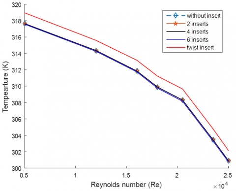 5. This simulation investigates at the friction factor for Reynolds numbers ranging from 5,000 to 25,000 in five different configurations: no inserts, two inserts, four inserts, six inserts, and twisted tape inserts. A decreasing pattern in friction factor is indicated with increasing Reynolds number. At Re = 16,030, the friction factors are 0.0264 (without inserts), 0.0635 (two inserts), 0.1005 (four inserts), 0.1323 (six inserts), and 0.0482 (twisted inserts).