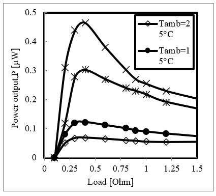 An experimental investigation for the integrated system, including ring, TEG, and heat sink, has been conducted to harvest the output voltage from the heat of human body. The ring has been placed in direct contact with the skin of the middle finger. All measurements were carried out under conditions where the person wearing the device was stationary. The tests were accomplished at a different time during the year to evaluate the temperature difference that would be achieved and the corresponding voltage and power that could be generated. The optimization of the internal resistance of a TEG is necessary, as mentioned in many parts of the literature. Figure 3 represents the maximum power as a function of load for different ambient temperatures.
