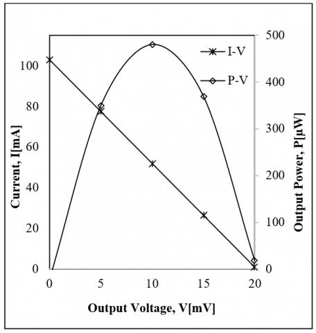 From Figure 4, it is clear that the maximum power output was about 70 µW. The value of power output slightly increased when the ambient temperature decreased due to increase in the temperature difference across the thermoelectric generator. For example, the maximum power output reached 120 µW when the ambient temperature decreased to 14℃, as shown in Figure 5.