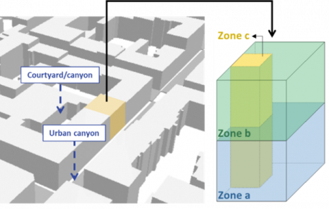 To apply wind corrections efficiently at the urban scale, building geometry must be simplified. In 2024, Santantonio et al. [10] introduced a three-zone lumped-parameter model that represents each building as two heated zones, upper and lower apartments, and an unheated shaft, enabling urban scale simulations of combined wind-driven and buoyancy-driven infiltrations using corrected wind-speed inputs. Similarly, multizone tools like CONTAM can perform pressure-driven airflow simulations with leakage and weather inputs, but they depend on user-defined external boundary conditions that are typically input with limited consideration of the surrounding environment [11].