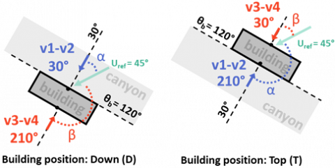 Figure 3. Building orientation (θb) and façade azimuth angle: canyon in blue, courtyard (or opposite) in red