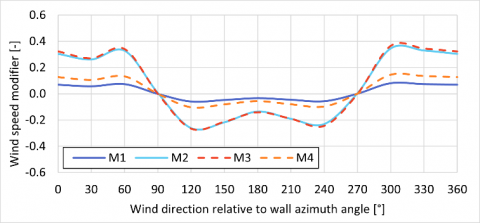 Wind speed modifiers are required for CONTAM to correctly account for the wind pressure, which is significant driving force for air infiltration, on the analyzed façade points. Eq. (1) provides the wind pressure (Pw) calculated in CONTAM.