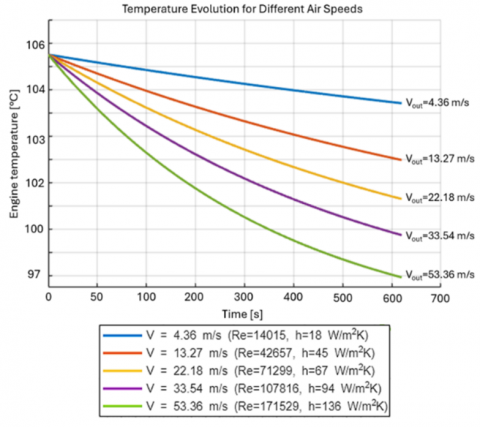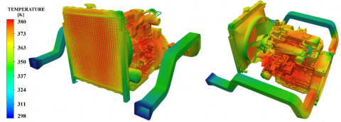 Figure 1 illustrates two simulated scenarios: (a) after 10 minutes of engine operation, and (b) after 1 hour of continuous operation. These simulations revealed the surface temperature distribution in critical engine components such as the cylinder head, engine sides, exhaust area, and radiator.