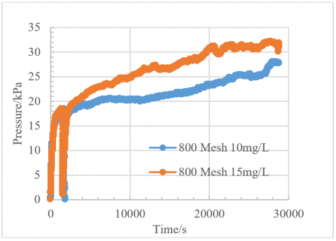 Comparing 800 mesh and 4000 mesh particles, for the same concentration change (from 10 mg/L to 15 mg/L), the pressure rise for the porous medium at 4000 mesh is greater. This is because the small 4000 mesh particles not only accumulate at the front of the filtration but also penetrate deep into the filtration material, clogging the pores through attachment retention, bridging, and other mechanisms. Their clogging mechanism is more complex and efficient. In contrast, 800 mesh large particles mainly form a cake layer through mechanical trapping at the surface of the filter material to increase pressure, resulting in a relatively slower clogging rate. Therefore, the effect of concentration change on the injection pressure of the porous medium is more pronounced at 4000 mesh, with both the pressure rise rate and the final pressure value being higher.