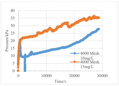For the 4000 mesh particle size, concentrations of 10 mg/L and 15 mg/L were also tested. As shown in Figure 12, the initial filtration point for the 15 mg/L experimental group is around 22 kPa, while the initial filtration point for the 10 mg/L experimental group is around 9 kPa. The initial filtration point for the high-concentration filtration liquid is clearly higher. Eventually, the injection pressure rises to more than twice the initial filtration point and continues to increase, which can be analyzed as follows.