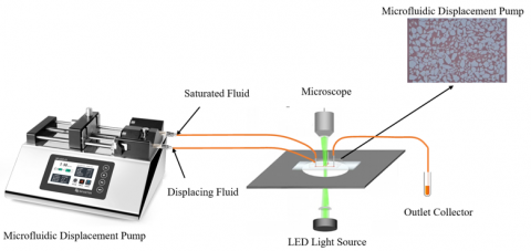 The entire experimental setup consists of two core modules: the fluid driving module and the microscopic observation module. The core equipment for the fluid control part is the microfluidic displacement pump, which can precisely control the liquid flow state in the experimental system.