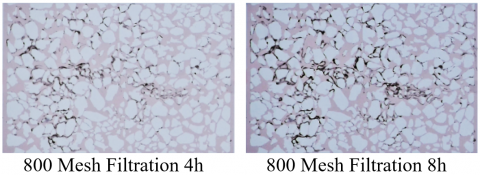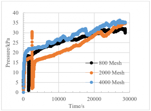 The large particle (800 Mesh) system shows pressure fluctuations at the initial stage of the experiment. This is because the filtration chip is pre-filled with dyed liquid during pre-treatment, and the liquid needs a certain initial driving force to begin filtering in the capillaries of the filtration pores. After this, the curve rises at a relatively steady rate, with a clear pressure inflection point marking the initial filtration point. In the 0-25 minute period, the initial filtration points for the 800 Mesh, 2000 Mesh, and 4000 Mesh experiments were 18 kPa, 16 kPa, and 22 kPa, respectively. As time progresses, after 4 hours, the pressures in all three experiments increase to 1.5 times the initial filtration point. After that, the slope of the pressure curve increases, and the pressure rises more rapidly due to clogging within the system, leading to reduced filtration permeability. At the end of the experiment, the pressure in the large particle system stabilizes, and the filtration clogging reaches stability. In contrast, the medium and small particle groups continue to experience rising pressure, exceeding 1.5 times the initial filtration point, indicating that filtration and clogging are still ongoing.
