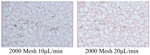 In the later filtration stages, the pressure accumulation in the 10 μL/min system exceeds that of the 20 μL/min system. The clogging condition is as shown in Figure 9. Mechanism analysis shows that at the low injection speed, particles gradually reduce the effective flow cross-section through continuous deep pore retention, while the dense accumulation layer formed at the early stage of high-speed injection may alter the flow field distribution inside the filter material, promoting secondary migration of some particles.