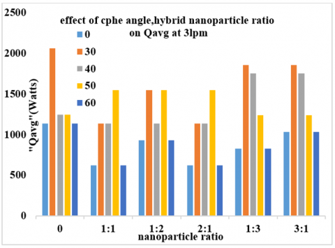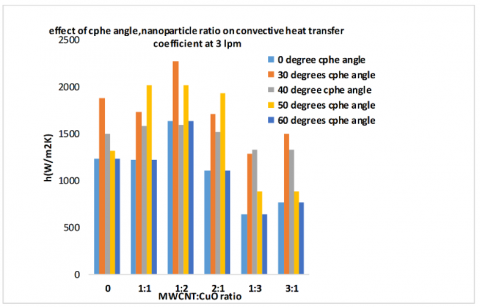 Figure 3 shows the influence of corrugated plate angle and nanoparticle ratio on the convective heat transfer coefficient (h). At a flow rate of 2 lpm, h attained a peak value of 1602 W/m2K at a corrugation angle of 60° with a 2:1 MWCNT:CuO nanoparticle ratio.