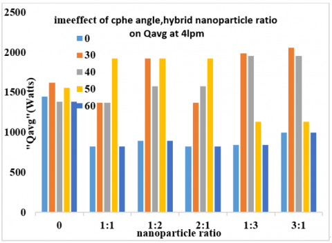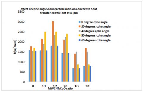 Figure 6 relates the influence of angle, nanoparticle ratio on h, at 4 lpm. Highest h(W/m2K) is 3021.942 W/m2K at 30°, with a 1:2 particle ratio.