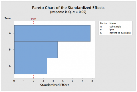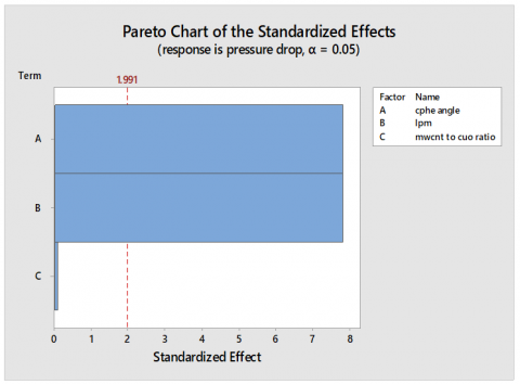 The minimum pressure drop was recorded at a 1:3 nanoparticle ratio and a flow rate of 3 lpm for the flat plate configuration, with a value of 6.90 Pa. In contrast, the maximum pressure drop occurred at a corrugation angle of 60°, a flow rate of 4 lpm, and a 3:1 MWCNT:CuO ratio, reaching 40.36 Pa. Figure 12 presents a Pareto chart generated using Minitab for pressure drop, which indicates that among the three parameters investigated, the nanoparticle ratio has an insignificant effect.