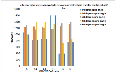 An increase in the convective heat transfer coefficient (h) was observed with increasing flow rate and at a CPHE corrugation angle of 30°, attributed to enhanced turbulence, thinner thermal boundary layers, and improved fluid mixing. The 1:2 MWCNT:CuO mixture exhibited the best performance at higher flow rates (3 and 4 lpm), due to a favourable balance between the high thermal conductivity of MWCNTs and the stability of CuO. The 2:1 ratio was also effective at lower flow rates (2 lpm). In contrast, the 3:1 and 1:3 ratios resulted in reduced performance, likely due to increased viscosity or nanoparticle agglomeration.