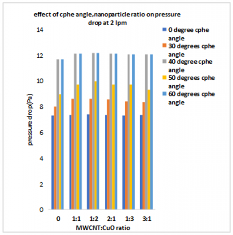 Figure 5 illustrates the influence of these parameters on pressure drop. At a flow rate of 2 lpm, the minimum pressure drop of 7.3 Pa was observed for the flat plate CPHE with a 1:3 MWCNT:CuO ratio.