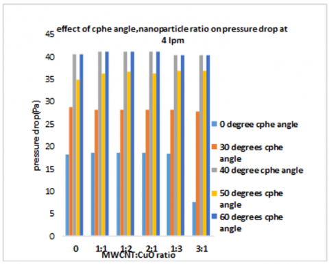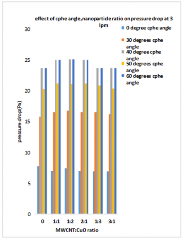 Figure 8 explains the influence of variables on pressure drop at 4lpm. Minimum pressure drop of 7.56Pa was found for flat plates at a 3:1 ratio of nano particles (MWCNT/CuO).