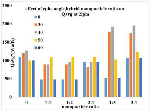 Figures 9-11 illustrate the effects of CPHE corrugation angle and nanoparticle ratio on the average heat transfer rate (Qₐᵥg) at flow rates of 2, 3, and 4 lpm, respectively. The heat transfer rate increased with flow rate for all angles, primarily due to enhanced turbulence and Brownian motion of the hybrid nanofluids. While the convective heat transfer coefficient (h) represents the thermal transfer between the middle solid plate and the cold or test fluid, Q depends on the product of mass flow rate and specific heat capacity of the fluids (mₕCₕ, mcCc) and the temperature difference.