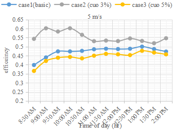 Figure 10. Efficiency percentage for every half hour of the day at a speed of 5 m/s for the three cases: The conventional case, and with 3% and 5% copper oxide