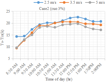 Figures 5, 6, and 7 show the temperature difference during the time from 8:30 a.m. to 2:00 p.m. in three cases (the conventional case, when adding 3% copper oxide and 5% copper oxide), at speeds (2.5, 3.5, and 5 m/s) and at mass flow rates (0.025, 0.035, and 0.05 kg/s). The best temperature difference was at CuO 3% at speed 2.5 m/s, where the greatest temperature differential, recorded at 12:30 p.m., was 23℃.