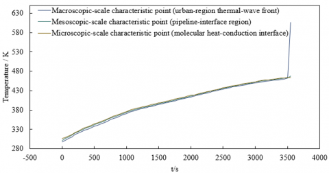 To elucidate the multi-scale propagation differences and coupling mechanisms of explosion-induced thermal waves in smart-city environments, temperature-rise measurements at characteristic points across different scales were conducted, as shown in Figure 2. In the short-time-scale subplot (Figure 2(a)), the microscopic-scale characteristic point exhibited the most rapid temperature rise and sustained the highest temperature, followed by the mesoscopic-scale characteristic point, whereas the macroscopic-scale point responded most slowly. This behavior indicates that, within short time intervals, thermal-wave energy transfer is dominated by microscopic thermal accumulation and mesoscopic pore-scale fluid–solid coupling. In the long-time-scale subplot (Figure 2(b)), an accelerated temperature increase was observed at the macroscopic-scale characteristic point during the later stage, and the temperatures at all scales eventually converged. This pattern reflects a synergistic coupling between macroscopic convective diffusion and multi-scale energy-transfer processes. These observations demonstrate that explosion-induced thermal-wave propagation in high-risk smart-city scenarios is characterized by pronounced temporal-scale differentiation. Microscopic–mesoscopic heat-transfer mechanisms dominate during the short-time regime, whereas macroscopic convection and cross-scale coupling effects become critical over longer time scales.