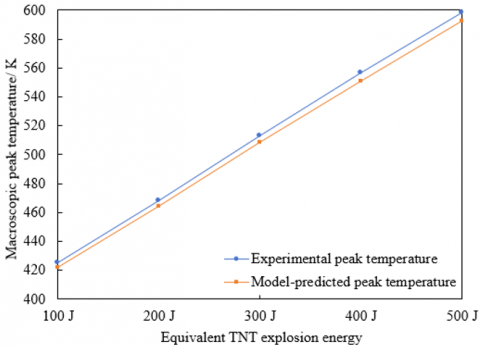 To validate the macroscopic-scale regulation of thermal-wave peak temperature by explosion energy and to assess the predictive accuracy of the proposed model under varying explosive intensities, a gradient experiment based on equivalent TNT explosion energy was conducted and compared with numerical predictions. As shown in Figure 3(a), a pronounced positive correlation can be observed between explosion energy and the thermal-wave peak temperature. As the equivalent TNT energy increased from 100 J to 500 J, the experimentally measured macroscopic peak temperature rose from 425.6 K to 598.2 K, representing a 40.5% increase. This trend is consistent with the physical relationship between energy release and thermal-wave intensity: higher explosion energy results in a larger total amount of converted thermal energy, thereby elevating the peak temperature at the thermal-wave front. The predicted values produced by the model exhibited excellent agreement with the experimental results across all energy levels. The prediction errors were consistently maintained below 1%, with an error of 0.82% for the 100 J condition and 0.95% for the 500 J condition. The predicted temperatures remained slightly lower than the experimental measurements because minor energy-loss mechanisms, including atmospheric heat dissipation, were incorporated into the model, rendering the prediction closer to realistic propagation conditions. These outcomes confirm that explosion energy constitutes the dominant macroscopic factor governing thermal-wave peak intensity and that the proposed model provides highly accurate predictions across diverse explosive-strength conditions, offering robust quantitative support for macroscopic thermal-wave assessment.