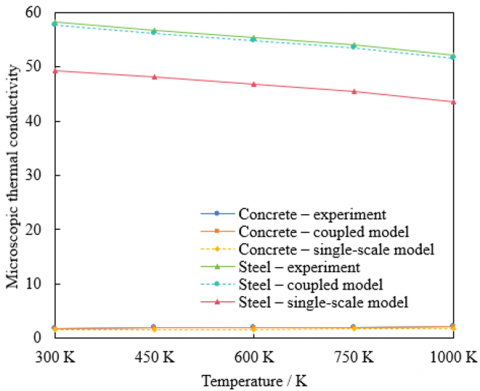 To elucidate the influence of building-material type, temperature, and cross-scale coupling mechanisms on thermal conductivity at the microscopic scale—and to provide accurate microscopic parameters for the multi-scale model—corresponding experimental analyses were performed. As shown in Figure 3(c), when temperature increased from 300 K to 1000 K, the thermal conductivity of concrete rose slowly from 1.85 W·m⁻¹·K⁻¹ to 2.14 W·m⁻¹·K⁻¹, whereas that of steel decreased from 58.2 W·m⁻¹·K⁻¹ to 52.1 W·m⁻¹·K⁻¹. This divergence is attributed to the fundamentally different microscopic heat-transfer mechanisms of the two materials. Heat conduction in concrete is jointly governed by pore fluid and solid skeleton; higher temperatures promote molecular thermal motion. In contrast, heat transfer in steel is dominated by phonon transport, where elevated temperatures intensify phonon scattering. The thermal-conductivity values predicted by the multi-scale coupled model were in excellent agreement with the experimental measurements, with errors consistently ≤1.6%. In comparison, single-scale model predictions were generally lower than the experimental values, with errors of 15–20% for concrete and 13–16% for steel. These discrepancies indicate that single-scale models neglect the energetic linkage across micro-, meso-, and macroscales. By contrast, the multi-scale coupling mechanism accurately captures both the microscopic origins and cross-scale transmission of thermal conduction, substantially improving parameter accuracy at the microscopic scale.