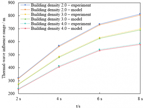 (d) Experimental–model comparison of the thermal-wave influence range under different building densities with multi-scale coupling