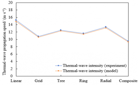 (b) Comparison between experimental and model-predicted thermal-wave propagation speed under different pipeline-network layouts at the mesoscopic scale