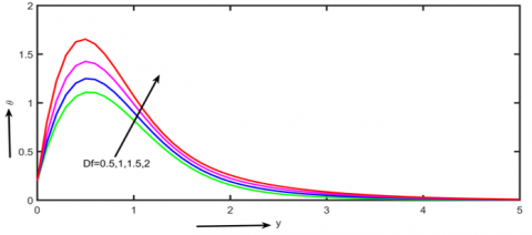 The impact of the Dufour number "Df" on temperature profiles is shown in Figures 10. Heat flux generated by a concentration gradient is referred to as the Dufour effect. Compared to when the Dufour effect is absent, the temperature profiles are greater when the Dufour effect is present. As a result, the boundary layer flow becomes more energetic as the Dufour number rises, and the thermal boundary layer thickness significantly rises when Dufour effects are present.