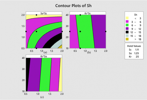 Under the quantified conditions, the statistical investigation was performed with 20 turns for Sh. Tables 3 and 4 present the coded coefficients and the effects of the statistical evaluation. The model demonstrates strong suitability for predicting Sh, with an R² value of 99.29% obtained through the applied statistical approach. Additionally, the adjusted R² for Sh is 99.03%. An R² of 98.21% designates that the perfect successfully explains nearly all the variation in the answer adjustable about its mean. In general, a higher R² reflects a better regression fit to the observed data.