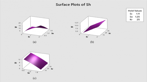Figures 16 (a)-(c) depicts the interaction plots for Sh, illustrating how the consequence of one issue may depend on the smooth of additional. Such interactions are important for optimizing experimental or simulation conditions.